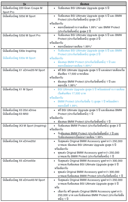 สำหรับลูกค้าที่เลือกเป็นเจ้าของรถยนต์บีเอ็มดับเบิลยูรุ่นต่าง ๆ ต่อไปนี้ ภายในวันที่ 30 กันยายน 2568 และเลือกทำสัญญาทางการเงินกับบีเอ็มดับเบิลยู ไฟแนนเชียล เซอร์วิส ประเทศไทย ยังจะได้รับข้อเสนอพิเศษดังนี้**:
