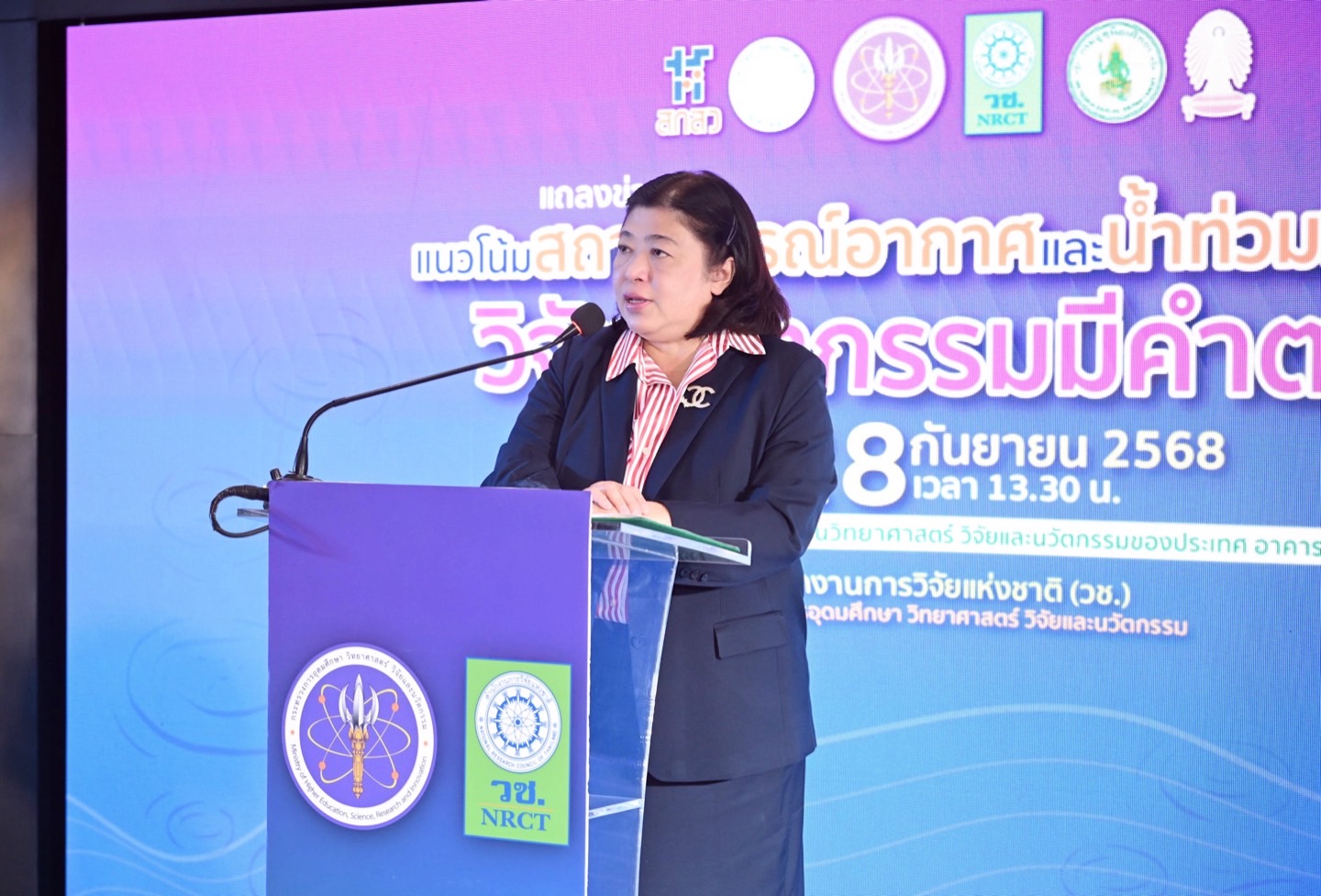 วันที่ 28 กันยายน 2568 สำนักงานการวิจัยแห่งชาติ (วช.) กระทรวงการอุดมศึกษา วิทยาศาสตร์ วิจัยและนวัตกรรม ร่วมกับเครือข่ายวิจัย ประกอบด้วย จุฬาลงกรณ์มหาวิทยาลัย มหาวิทยาลัยเกษตรศาสตร์ และกรมอุตุนิยมวิทยา จัดกิจกรรมแถลงข่าว “แนวโน้มสถานการณ์อากาศและน้ำท่วมในภาคกลาง วิจัยนวัตกรรมมีคำตอบ” โดย ดร.วิภารัตน์ ดีอ่อง ผู้อำนวยการสำนักงานการวิจัยแห่งชาติ เป็นประธาน ณ ศูนย์ข้อมูลสารสนเทศกลางด้านวิทยาศาสตร์ วิจัยและนวัตกรรมของประเทศ วช.