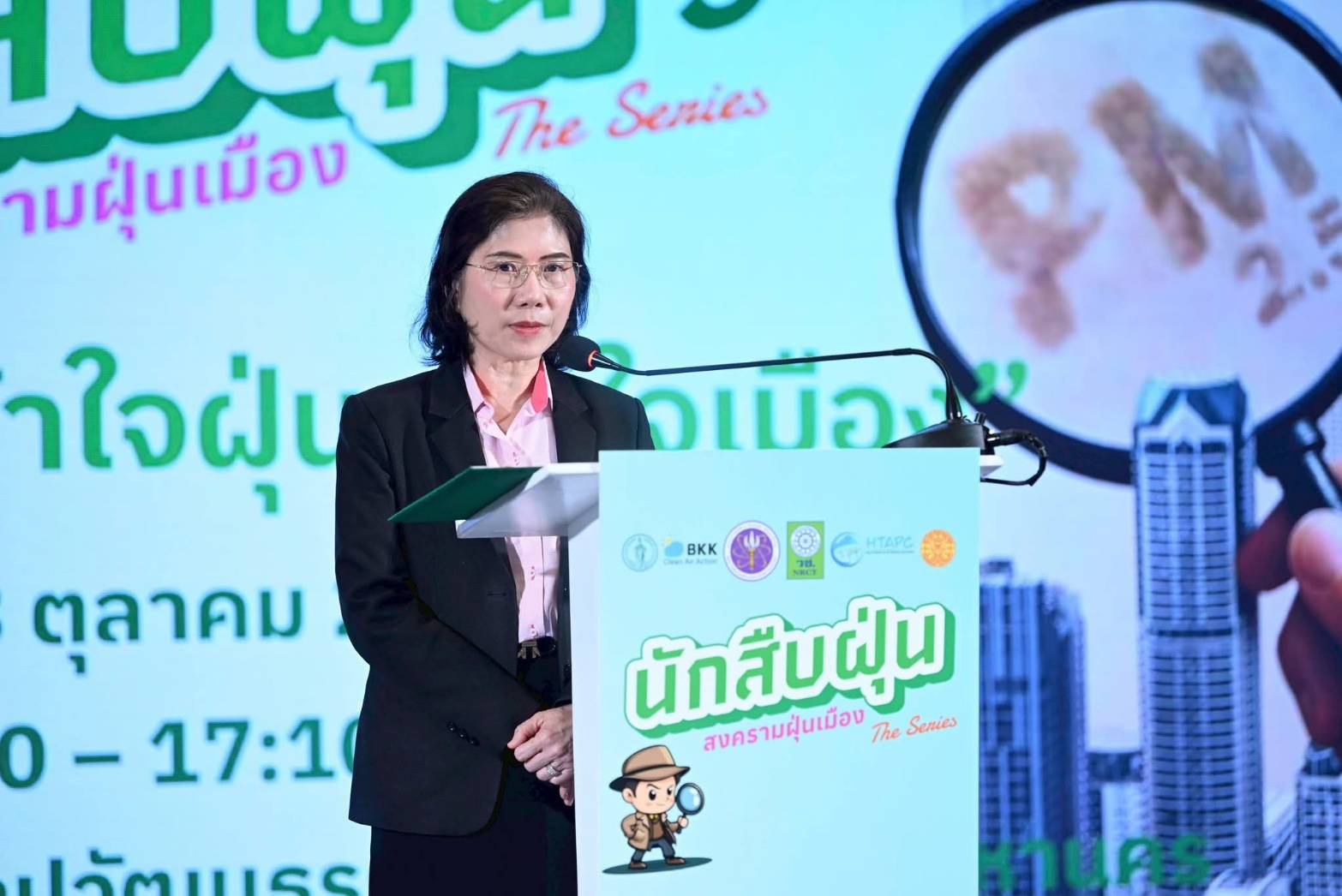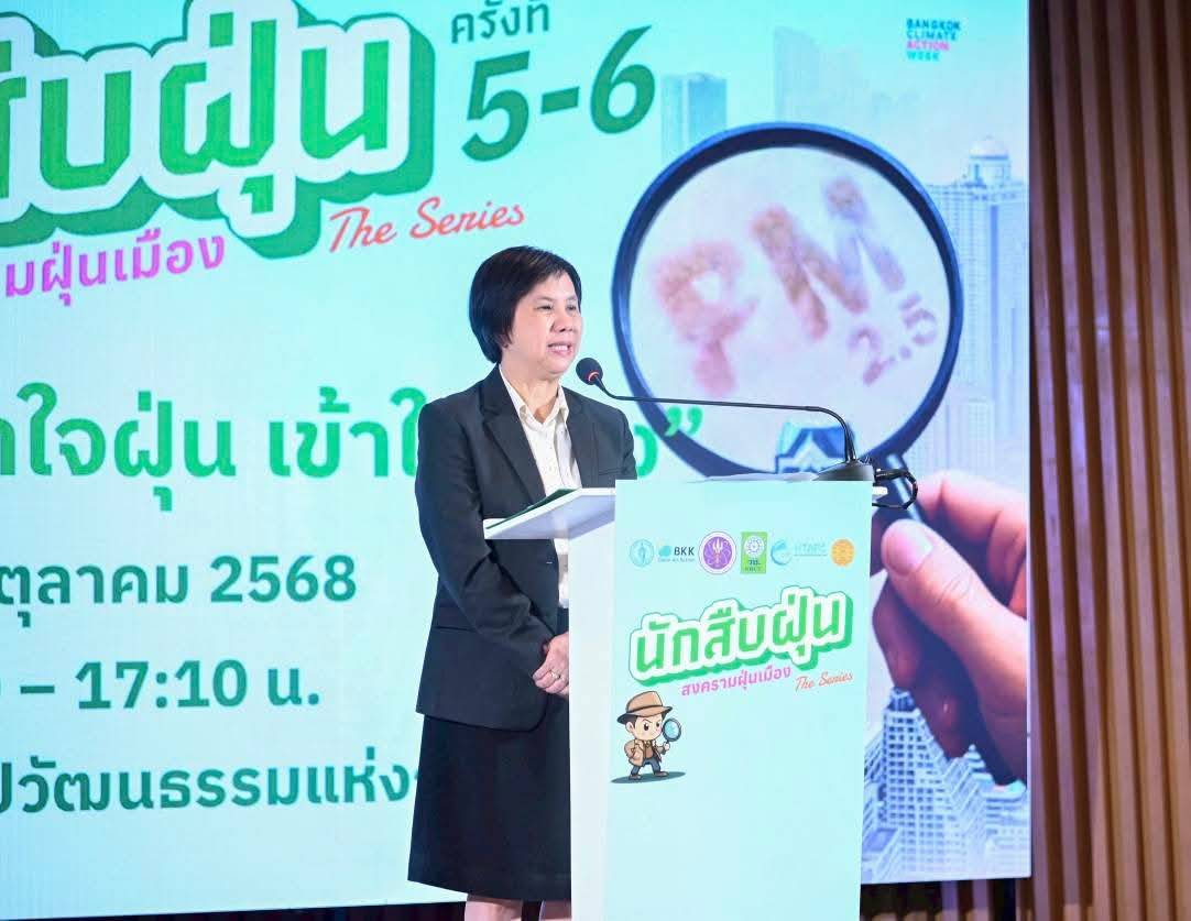 นางเลิศลักษณ์ ลีลาเรืองแสง รองปลัดกรุงเทพมหานคร กล่าวว่า ในนามของกรุงเทพมหานคร รู้สึกเป็นเกียรติและยินดีอย่างยิ่งที่ได้กล่าวต้อนรับทุกท่านในกิจกรรม “นักสืบฝุ่น The Series” ครั้งที่ 5 ภายใต้หัวข้อ “สืบจากฝุ่น” และครั้งที่ 6 ภายใต้หัวข้อ “เข้าใจฝุ่น เข้าใจเมือง” ในวันนี้ ซึ่งจัดขึ้นด้วยวัตถุประสงค์เดียวกัน คือเพื่อแลกเปลี่ยนเรียนรู้และร่วมกันแสวงหาทางออกต่อปัญหาฝุ่น PM2.5 และหมอกควัน ที่ยังคงเป็นวิกฤตสำคัญของประเทศไทยโดยเฉพาะในเขตเมืองใหญ่อย่างกรุงเทพฯ ช่วงเช้า เน้นการศึกษาความซับซ้อนของฝุ่น ตั้งแต่แหล่งกำเนิด ยานพาหนะ องค์ประกอบฝุ่นในระดับความสูงต่าง ๆ ไปจนถึงกลไกการเกิดมลพิษทุติยภูมิ ส่วนช่วงบ่าย เน้นการทำความเข้าใจปัญหาจากมุมมองของประชาชน กรุงเทพมหานคร ขอขอบคุณ วช. ที่ให้การสนับสนุนองค์ความรู้และทุนวิจัยในโครงการที่เกี่ยวข้องกับปัญหาฝุ่นในกรุงเทพฯ รวมทั้งพันธมิตรทุกภาคส่วนที่ร่วมกันขับเคลื่อนกิจกรรม “นักสืบฝุ่น The Series” ครั้งที่ 5 และ ครั้งที่ 6 เพื่อให้เราทุกคนร่วมกันผลักดันกรุงเทพมหานคร สู่การเป็น “เมืองอากาศสะอาด” ที่มีนโยบายและมาตรการที่ชัดเจน เป็นรูปธรรม และนำไปสู่คุณภาพชีวิตที่ดียิ่งขึ้นของประชาชนอย่างยั่งยืน