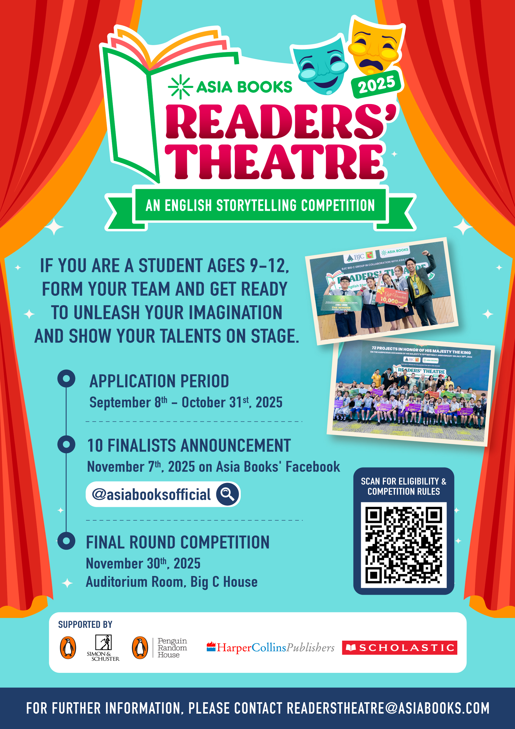 สำหรับท่านที่สนใจสามารถสอบถามรายละเอียดกติกาการแข่งขัน ตรวจสอบข้อมูลเพิ่มเติมได้ที่ www.asiabooks.com หรือ readerstheatre@asiabooks.com