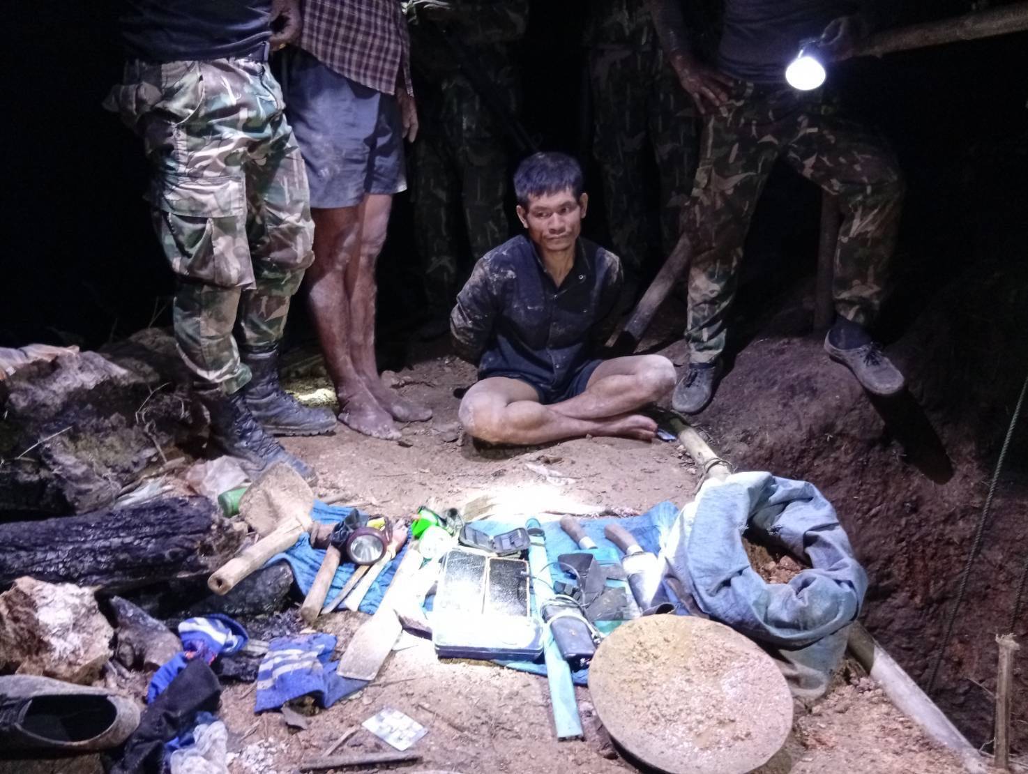 ผลการจับกุมพบ นายโซเอะเกดุ (ไม่มีนามสกุล) อายุ 34 ปี สัญชาติพม่า จากหมู่บ้านยาพู ประเทศเมียนมา แอบหลบอยู่ในหลุมขุดดิน พร้อมยึดของกลาง 13 รายการ ได้แก่ กระสอบดิน 8 กิโลกรัม มีดดาบ กระสุนปืน .22 LR จำนวน 5 นัด โทรศัพท์มือถือ 2 เครื่อง อุปกรณ์ขุดดินและร่อนแร่ รวมมูลค่าความเสียหาย 756307 บาท ทั้งนี้ ผู้ต้องหาให้การว่าเดินทางเข้าเมืองไทยผ่านช่องทางธรรมชาติช่องป่าหมาก-ยาพู พร้อมเพื่อนอีก 3 คน โดยถูกชักชวนให้มาขุดดินหาแร่ทองคำ