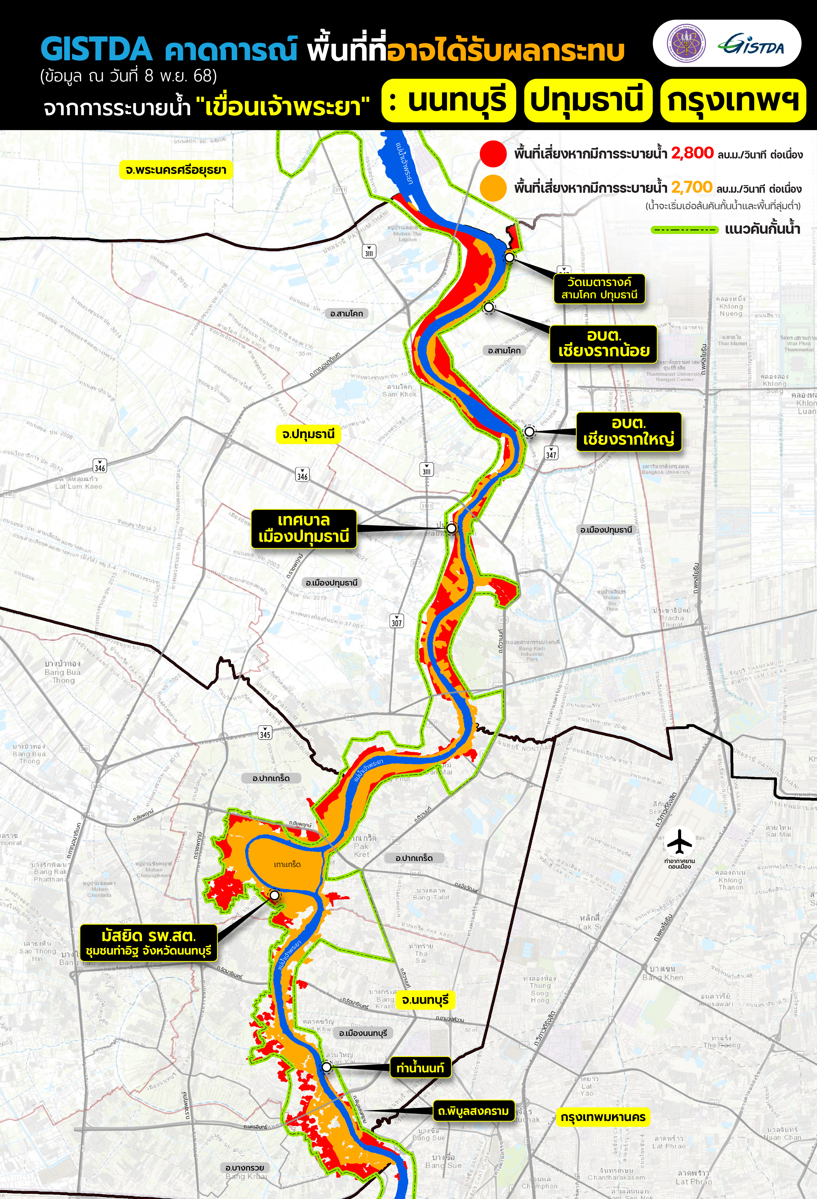 กระทรวงการอุดมศึกษา วิทยาศาสตร์ วิจัยและนวัตกรรม โดยสำนักงานพัฒนาเทคโนโลยีอวกาศและภูมิสารสนเทศ (องค์การมหาชน) หรือ GISTDA เปิดเผยภาพจากดาวเทียมเปรียบเทียบล่าสุด แสดงให้เห็นถึง “ความแม่นยำ” ของแบบจำลองพื้นที่เสี่ยงน้ำท่วมจากการระบายน้ำของเขื่อนเจ้าพระยา ซึ่งก่อนหน้านี้ได้คาดการณ์ไว้ว่าหากมีการปล่อยน้ำในอัตรา 2700-2800 ลูกบาศก์เมตรต่อวินาที จะทำให้พื้นที่ริมแม่น้ำเจ้าพระยาตอนล่าง ตั้งแต่จังหวัดพระนครศรีอยุธยาไล่ลงมาถึงนนทบุรี ปทุมธานี และกรุงเทพมหานคร เกิดน้ำท่วมในหลายจุด