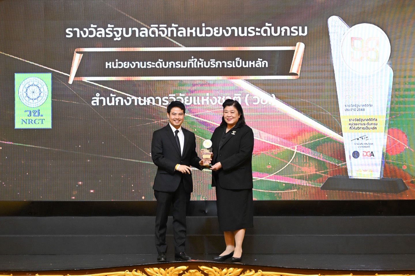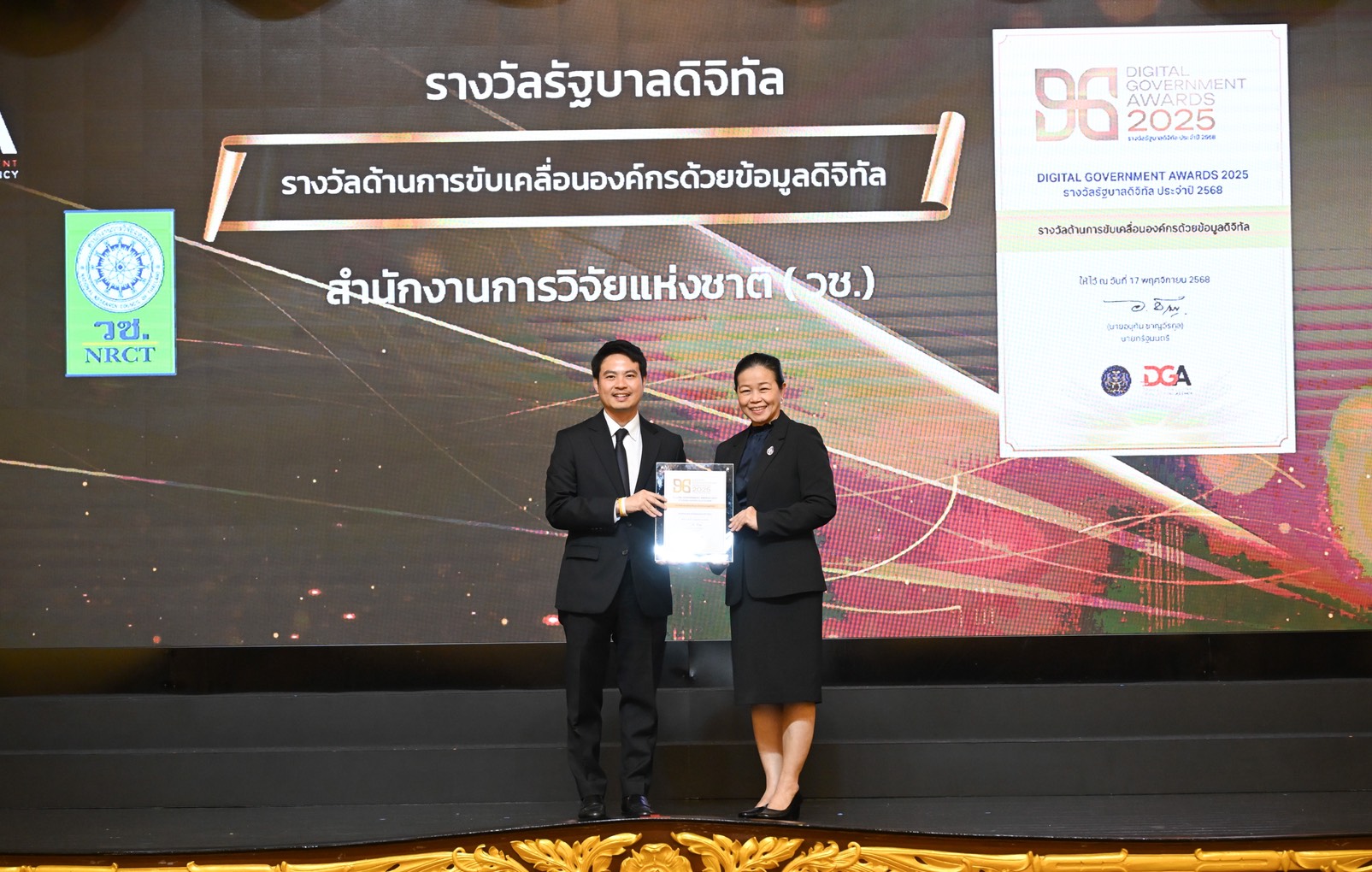 วันที่ 17 พฤศจิกายน 2568 สำนักงานการวิจัยแห่งชาติ(วช.) กระทรวงการอุดมศึกษา วิทยาศาสตร์ วิจัยและนวัตกรรม ร่วมพิธีรับรางวัลรัฐบาลดิจิทัล ประจำปี 2568 (Digital Government Awards 2025) จัดโดยสำนักงานพัฒนารัฐบาลดิจิทัล (องค์การมหาชน) โดยมี นายภราดร ปริศนานันทกุล รัฐมนตรีประจำสำนักนายกรัฐมนตรี เป็นประธานในการมอบรางวัลและประกาศเกียรติคุณ ซึ่งในปีนี้ ดร.วิภารัตน์ ดีอ่อง ผู้อำนวยการสำนักงานการวิจัยแห่งชาติ เข้ารับรางวัลอันดับ 1 รัฐบาลดิจิทัล หน่วยงานระดับกรมที่ให้บริการเป็นหลัก พร้อมนี้ นางมารยาท ตั้งมิตรเจริญ ผู้อำนวยการกองระบบและบริหารข้อมูลเชิงยุทธศาสตร์ ด้านวิทยาศาสตร์ วิจัยและนวัตกรรม วช.ยังเข้ารับรางวัลด้านการขับเคลื่อนองค์กรด้วยข้อมูลดิจิทัล อีกรางวัลด้วย ณ ตึกสันติไมตรี ทำเนียบรัฐบาล