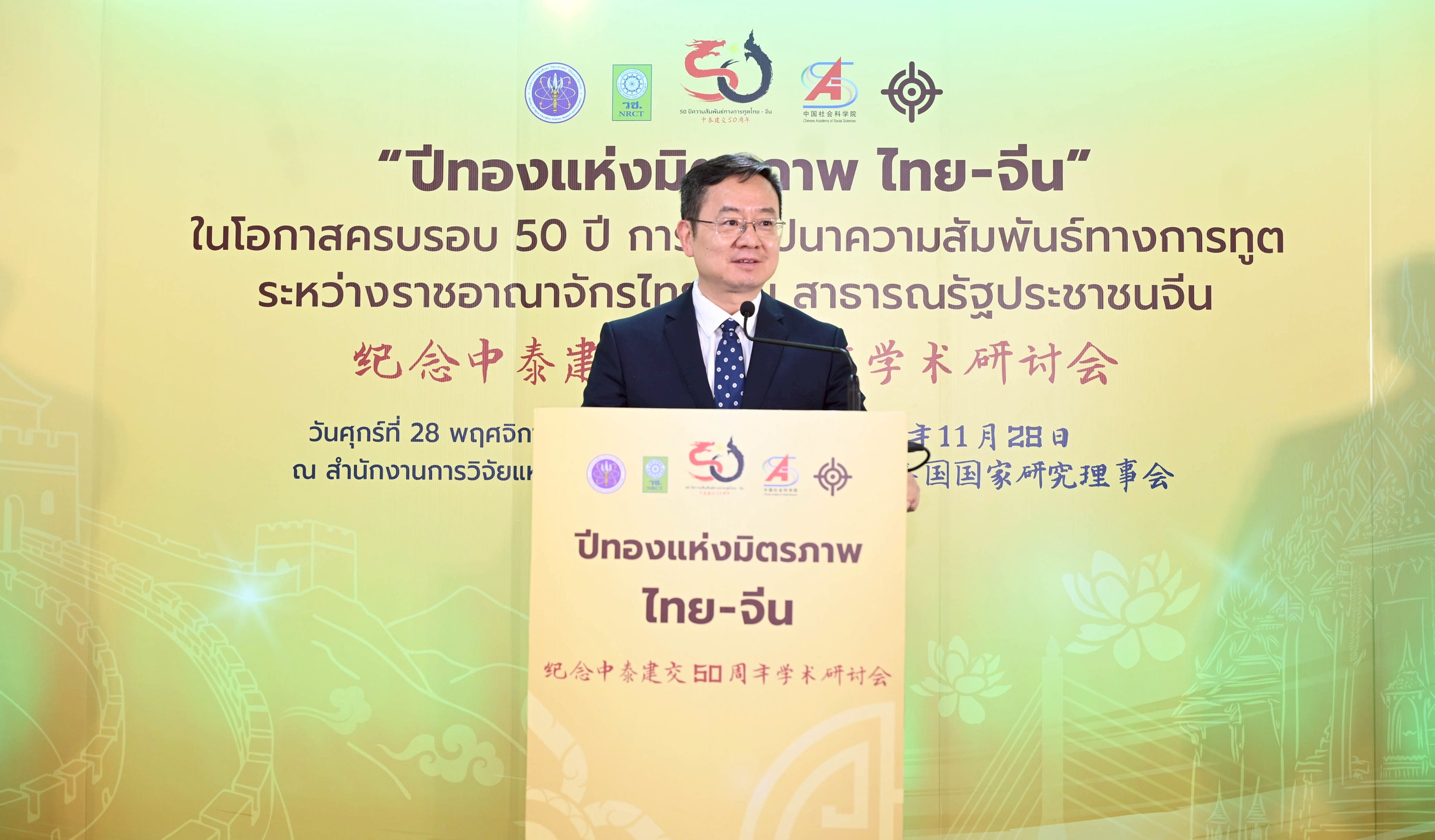 เมื่อวันที่ 28 พ.ย. นายสุรศักดิ์ พันธ์เจริญวรกุล รัฐมนตรีว่าการกระทรวงการอุดมศึกษา วิทยาศาสตร์ วิจัยและนวัตกรรม (อว.) เป็นประธานเปิดงาน “ปีทองแห่งมิตรภาพ ไทย–จีน” เนื่องในโอกาสครบรอบ 50 ปี การสถาปนาความสัมพันธ์ทางการทูตระหว่างประเทศไทยและสาธารณรัฐประชาชนจีน พร้อมกล่าวปาฐกถาพิเศษในหัวข้อ “ไทย–จีน สานพลังขับเคลื่อนอนาคตด้วยวิทยาศาสตร์ วิจัย และนวัตกรรม” โดยมี ศ.เกา เสียง ประธานสถาบันสังคมศาสตร์จีน (CASS) เป็นประธานร่วมเปิดงาน และมี ดร. วิภารัตน์ ดีอ่อง ผู้อำนวยการสำนักงานการวิจัยแห่งชาติ คณะผู้บริหารสำนักงานการวิจัยแห่งชาติ ข้าราชการ และเจ้าหน้าที่ เข้าร่วม ณ สำนักงานการวิจัยแห่งชาติ