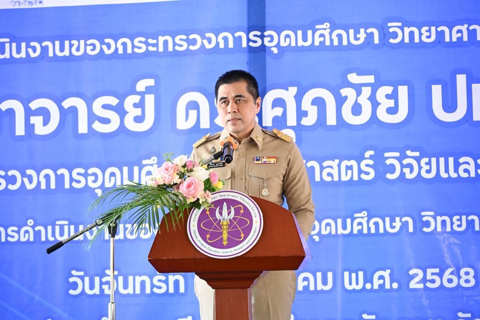 วันที่ 15 ธันวาคม 2568 ศ.ดร.ศุภชัย ปทุมนากุล ปลัดกระทรวงการอุดมศึกษา วิทยาศาสตร์ วิจัยและนวัตกรรม ลงพื้นที่จังหวัดนครราชสีมา เพื่อติดตามการขับเคลื่อนงานด้านการอุดมศึกษา วิทยาศาสตร์ วิจัยและนวัตกรรม ในการยกระดับคุณภาพชีวิตประชาชนและเสริมสร้างความเข้มแข็งให้กับเศรษฐกิจฐานราก พร้อมด้วย คณะผู้บริหาร วช. ผู้บริหารหน่วยงานในสังกัดกระทรวง อว. ผู้บริหารจังหวัด และหน่วยงานที่เกี่ยวข้องเข้าร่วม ติดตามการขับเคลื่อน อววน. ในพื้นที่ พร้อมกันนี้ ดร.วิภารัตน์ ดีอ่อง ผู้อำนวยการสำนักงานการวิจัยแห่งชาติ นางสาวเสาวนีย์ มุ่งสุจริตการ รองผู้อำนวยการสำนักงานการวิจัยแห่งชาติ พร้อมด้วยคณะผู้บริหาร วช. ติดตามการขับเคลื่อน อววน. ในพื้นที่ ณ วัดป่าหนองบัวเกาะเพชร อำเภอจักราช จังหวัดนครราชสีมา