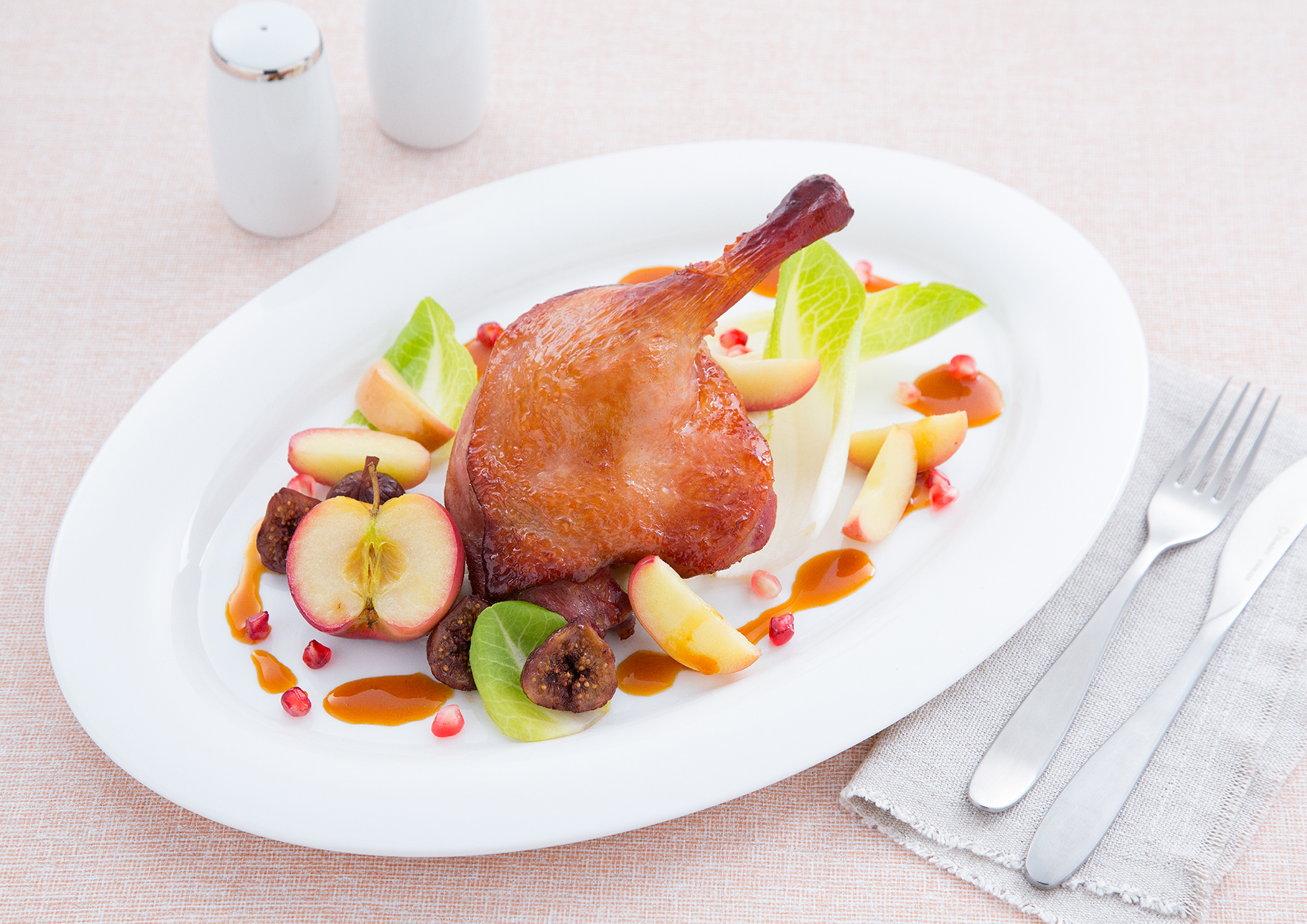 เมนูถัดมาคือ น่องเป็ดกงฟีต์ (Duck Leg Confit) เป็นเมนูอาหารฝรั่งเศส น่องเป็ดตุ๋นเนื้อนุ่มละมุนลิ้น ปรุงรสชาติน่องเป็ดกลมกล่อม และมีเนื้อสัมผัสที่นุ่มลิ้น หอมกลิ่นเครื่องเทศ โดยสามารถนำมาปรุงง่ายๆ เพียงนำน่องเป็ดออกมาผัดกับน้ำมันเป็ดที่บรรจุอยู่ในซอง เพื่อให้หนังเป็ดมีความกรอบหอม แต่ยังคงความนุ่มฉ่ำไว้ข้างใน สามารถรับประทานได้เลย หรือ เสิร์ฟพร้อมกับมันฝรั่งลูกเล็ก และผักชนิดต่างๆ ที่ผ่านการผัดกับน้ำมันเป็ดทำให้อร่อยยิ่งขึ้น เพียงเท่านี้ก็จะได้เมนูเป็ดอาหารนานาชาติ ระดับภัตตาคาร เสิร์ฟในงานเลี้ยงสังสรรค์ในช่วงเทศกาลปีใหม่