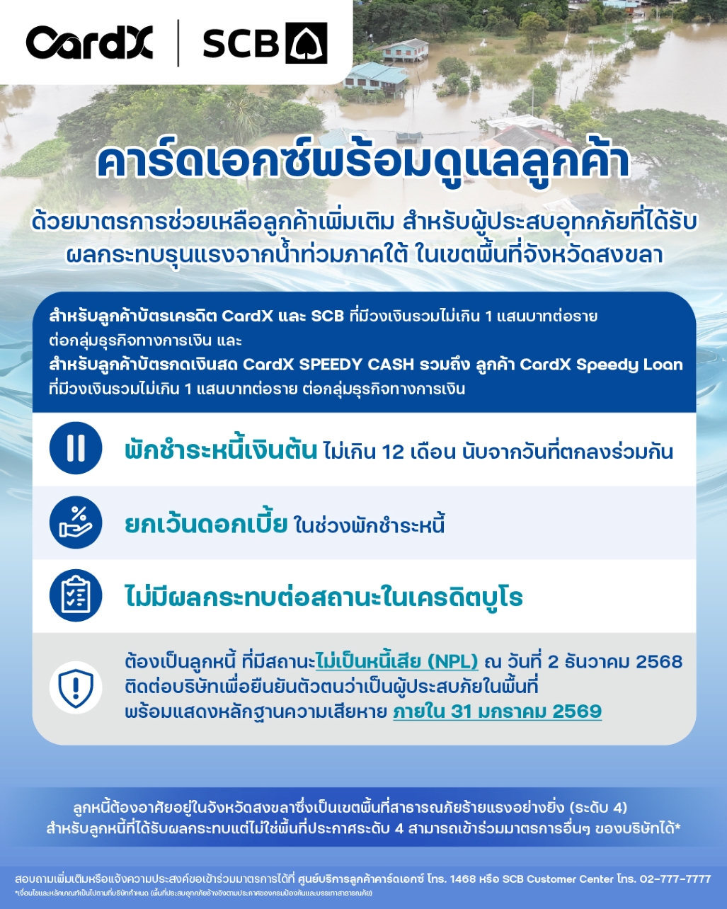 โดยลูกค้าสามารถติดต่อขอเข้าร่วมมาตรการ เพื่อยืนยันตัวตนว่าเป็นผู้ประสบภัยในพื้นที่ พร้อมแสดงหลักฐานความเสียหาย ภายใน 31 มกราคม 2569 ได้ที่ ศูนย์บริการลูกค้าคาร์ดเอกซ์ โทร.1468 หรือ SCB Customer Center โทร 02-777-7777