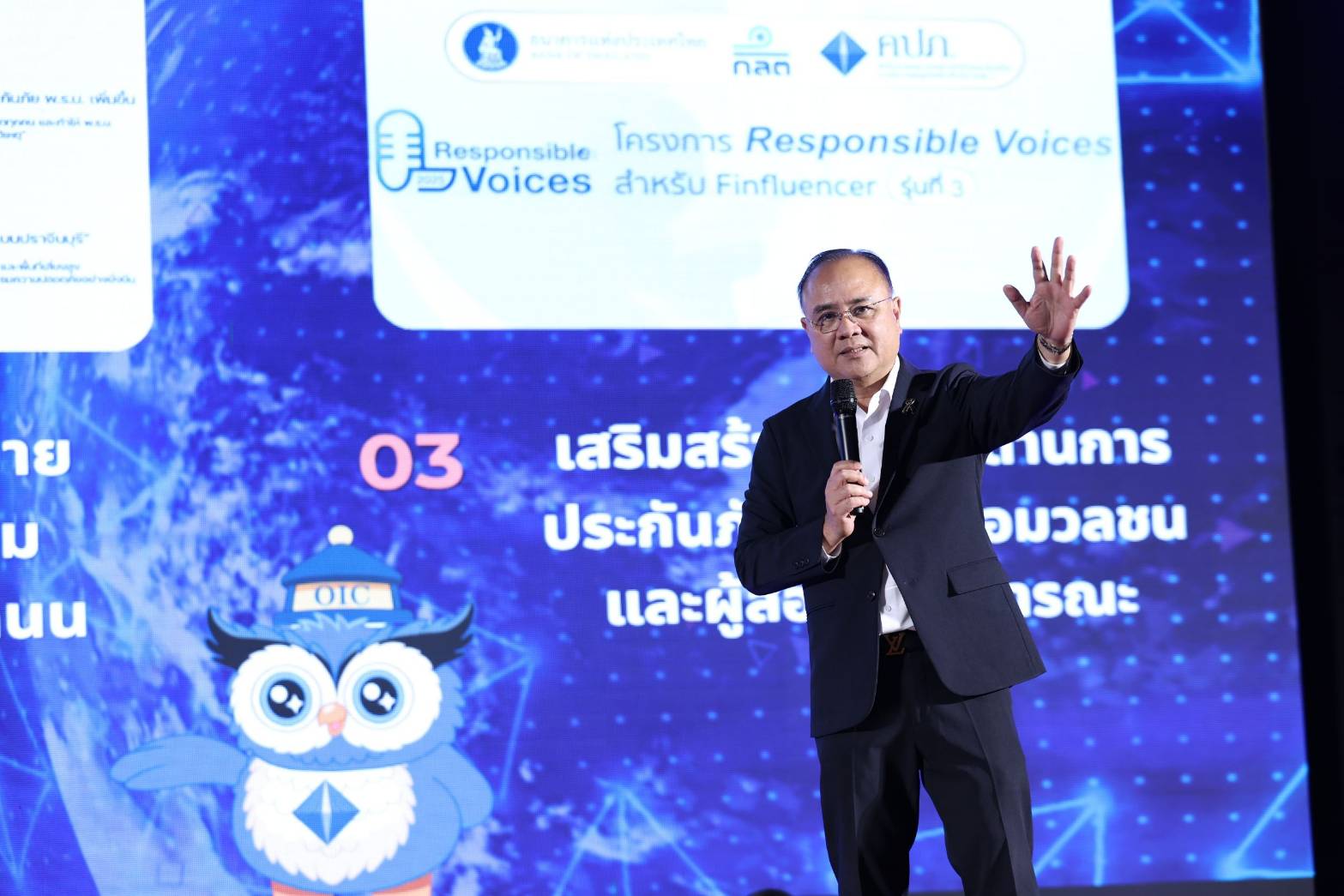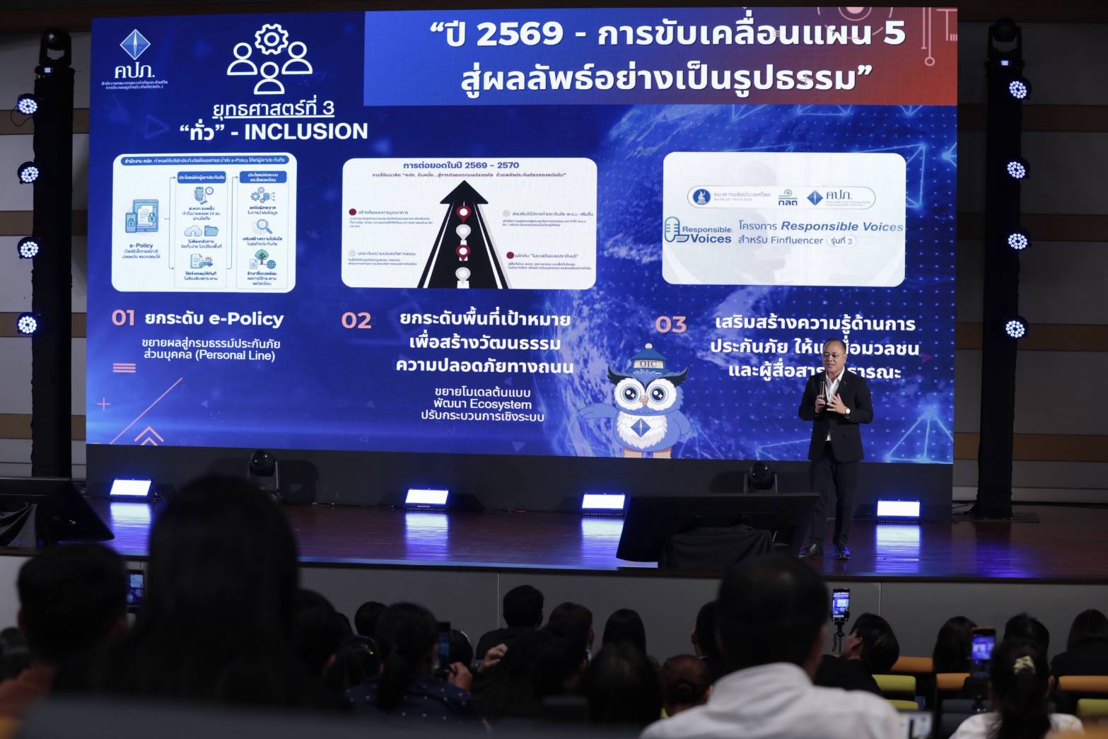 ประเด็นที่ 3 เสริมสร้างความรู้ด้านการประกันภัยให้แก่สื่อมวลชนและผู้สื่อสารสาธารณะ สำนักงาน คปภ. ให้ความสำคัญกับการพัฒนาเครือข่ายนักสื่อสารคุณภาพ เพื่อให้ประชาชนได้รับข้อมูลด้านการประกันภัยที่ถูกต้องและเชื่อถือได้ โดยต่อยอดโครงการ Responsible Voices สำหรับ Finfluencer ซึ่งที่ผ่านมาได้ดำเนินการแล้ว 2 รุ่น มีผู้เข้าร่วมรวม 87 คน และเข้าถึงประชาชนกว่า 34 ล้านคน พร้อมทั้งเตรียมจัดกิจกรรม Reunion และเปิดอบรมรุ่นที่ 3 ในปี 2569 ควบคู่กับการจัดหลักสูตรและ Workshop สำหรับสื่อมวลชนและผู้สื่อสารสาธารณะ เพื่อยกระดับความเข้าใจด้านประกันภัย กฎหมาย และบทบาทการกำกับดูแล นอกจากนี้ ยังได้เปิดตัว “น้องพิทักษ์ (PITAK)” มาสคอตประจำสำนักงาน คปภ. เพื่อเป็นตัวแทนในการสื่อสารข้อมูล ข่าวสาร และสิทธิประโยชน์ด้านการประกันภัยให้ประชาชนเข้าใจได้ง่าย เข้าถึงได้มากขึ้น และสามารถใช้ประกันภัยเป็นเครื่องมือในการ สร้างความมั่นคงทางการเงินได้อย่างมั่นใจ