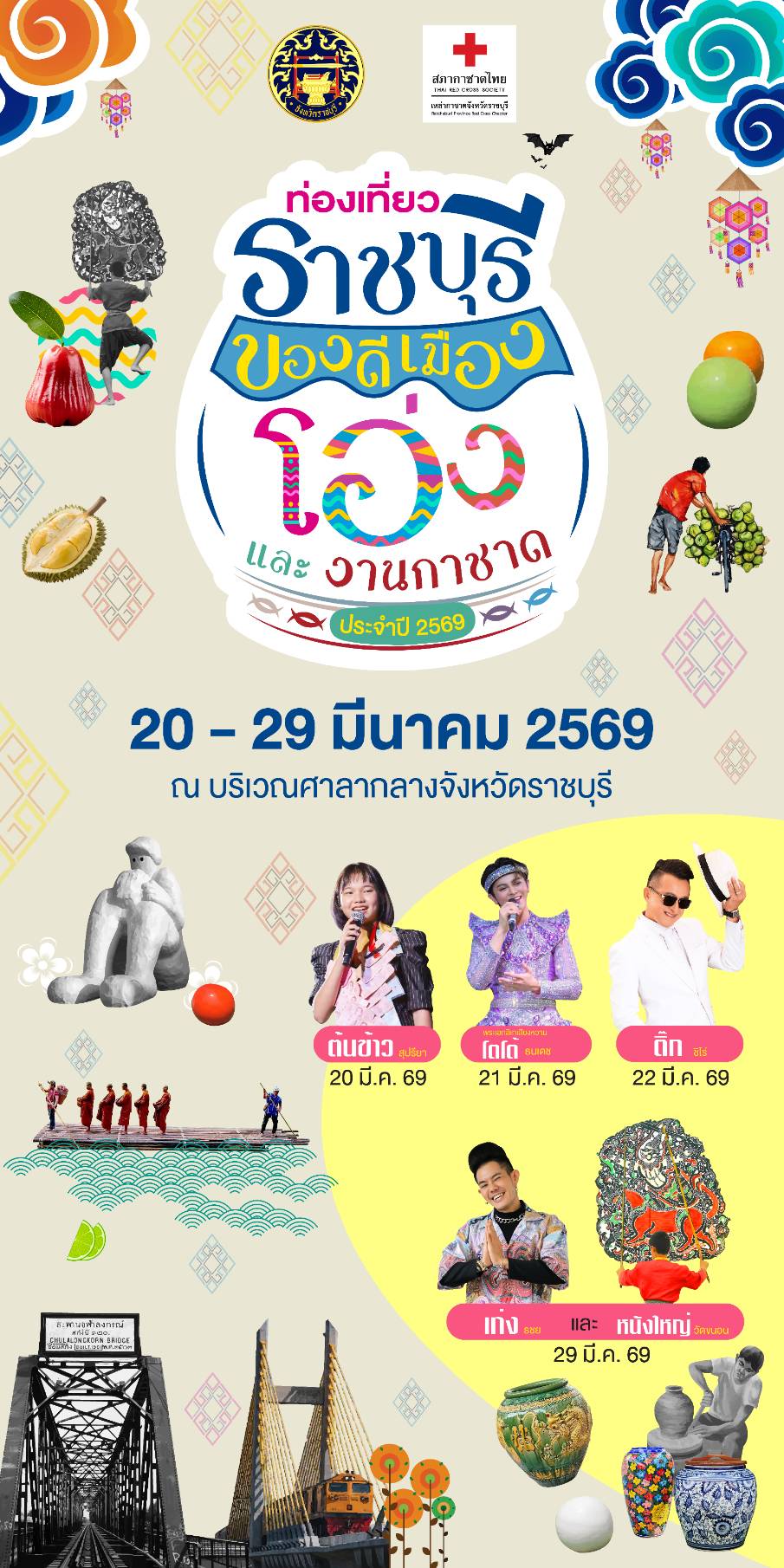 กลับมาอีกครั้ง กับงานสุดอลัง ที่ทุกคนรอคอย “ท่องเที่ยวราชบุรี ของดีเมืองโอ่ง และงานกาชาด ประจำปี 2569” ระหว่างวันที่ 20 – 29 มีนาคม 2569 นี้ ณ บริเวณศาลากลางจังหวัดราชบุรี