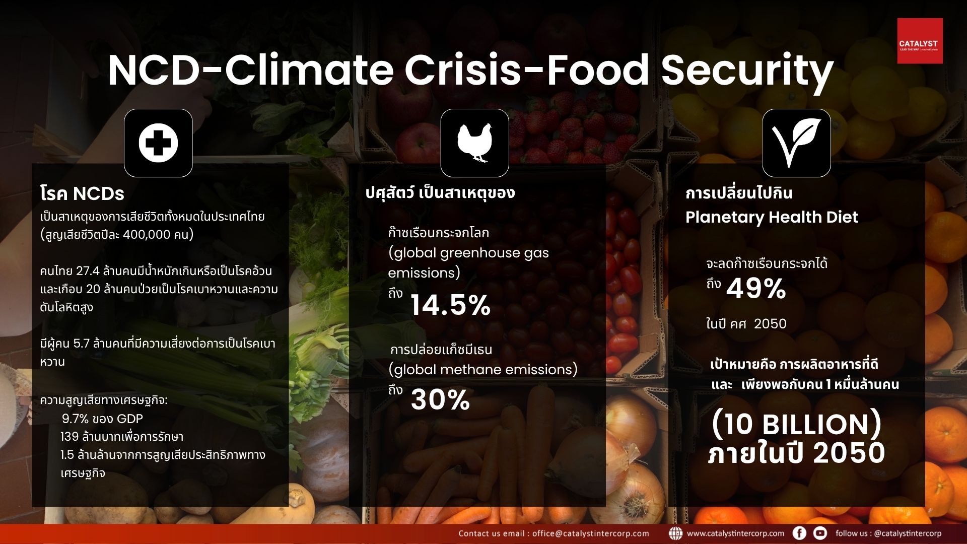 คะตะลิสต์เปิดกว้างสำหรับ ภาคธุรกิจ ที่ต้องการยกระดับมาตรฐาน ESG ด้วยการเปลี่ยนผ่านสู่วัตถุดิบที่มีสวัสดิภาพ สถาบันการศึกษา ที่สนใจโครงการอาหารกลางวันยั่งยืน หน่วยงานภาครัฐ องค์กรด้านสุขภาพ ที่ต้องการพันธมิตรด้านนโยบายสุขภาพและสิ่งแวดล้อม ขอเชิญร่วมงานสัมมนาออนไลน์นานาชาติ "International Symposium on NCD SMART Food 2026" ในวันที่ 7 เมษายน 2569 (ภาคบ่าย – บรรยายภาษาไทย) โดยมีวิทยากรผู้เชี่ยวชาญทั้งจากไทยและต่างประเทศ และพบกับวิทยากรระดับโลก อาทิ Dr. Michael Greger MD FACLM ผู้เขียนหนังสือ How Not To Die คัมภีร์ชนะทุกโรค เพื่อร่วมกันหาแนวทางขับเคลื่อนประเทศไทยสู่สังคมสุขภาพดีอย่างยั่งยืน ลงทะเบียนฟรี ที่ https://luma.com/8kllmf5z และติดตามความเคลื่อนไหวเพื่อร่วมงานในโครงการต่าง ๆ กับ CATALYST ได้ทาง เพจ catalystintercorp โทร. 096-186-7862 หรืออีเมล office@catalystintercorp.com