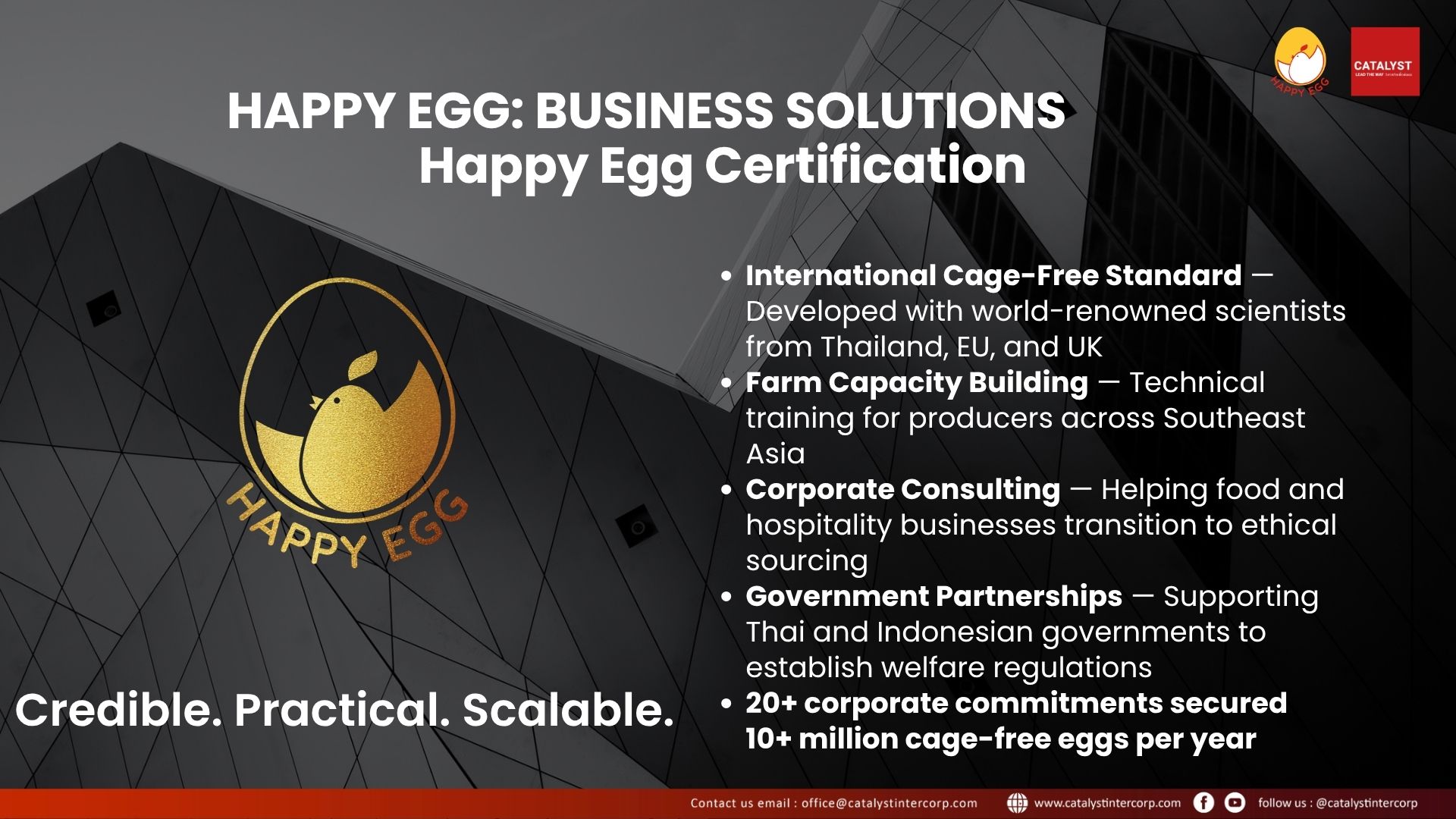 นอกจากนี้ คะตะลิสต์ ได้สร้างมาตรฐานการรับรอง "Happy Egg" เป็นมาตรฐาน Cage-Free รายแรกในเอเชีย ซึ่งพัฒนาร่วมกับ University College Dublin ประเทศไอร์แลนด์ และ University of Bristol ของสหราชอาณาจักร เพื่อให้ไข่ไก่ไร้กรงให้มีสวัสดิภาพและมาตรฐานเทียบเท่าสากลสำหรับการส่งออก