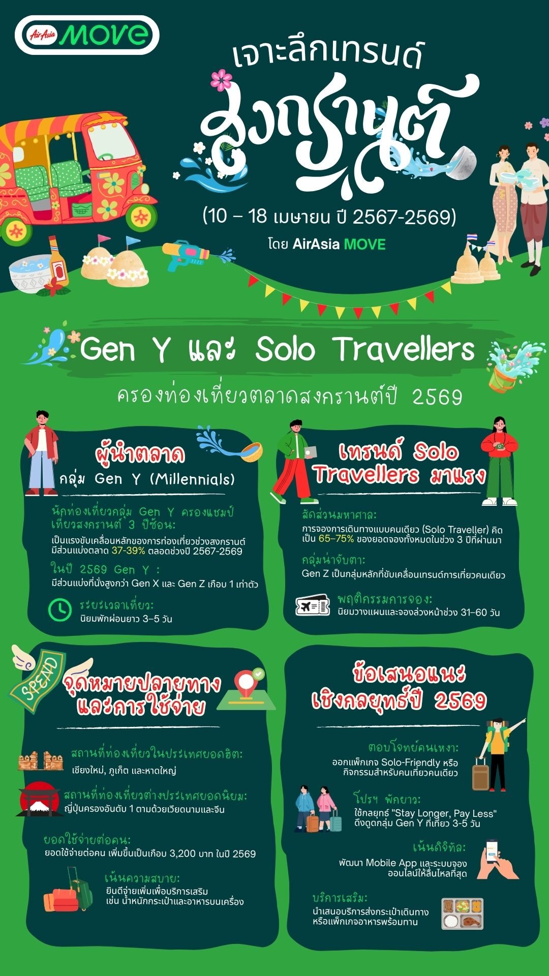 กรุงเทพฯ 30 มีนาคม 2569 – AirAsia MOVE แพลตฟอร์มการท่องเที่ยวชั้นนำของภูมิภาค เปิดเผยอินไซต์ " Songkran Travel Trends (2567-2569)" วิเคราะห์พฤติกรรมการเดินทางท่องเที่ยวของคนไทยในช่วงเทศกาลสงกรานต์ (10-18 เมษายน) ตลอด 3 ปีที่ผ่านมา พบการเปลี่ยนแปลงที่น่าสนใจของนักเดินทางกลุ่มหลัก โดยเฉพาะพลังของ Gen Y (Millennials) และเทรนด์การเที่ยวคนเดียว (Solo Traveller) ที่พุ่งสูงขึ้นอย่างต่อเนื่อง