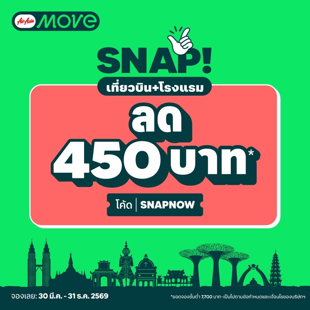 AirAsia MOVE จัดเต็มดีลสุดคุ้มต้อนรับฤดูกาลท่องเที่ยว (High Season) ให้คุณออกไปสำรวจโลกได้ในราคาประหยัดกว่าเดิม ด้วยส่วนลดพิเศษสำหรับจองโรงแรมทั่วโลก ลดเพิ่มทันที 400 บาท เพียงใส่โค้ด MOVEHOTELS50 (เมื่อมียอดจองขั้นต่ำ 3000 บาท) และสำหรับสายเที่ยวแบบแพ็กเกจสุดคุ้มกับ SNAP! (เที่ยวบิน โรงแรม) ทุกจุดหมายปลายทาง รับส่วนลดเพิ่ม 450 บาท เมื่อใส่โค้ด SNAPNOW (เมื่อมียอดจองขั้นต่ำ 7700 บาท) จองเลยวันนี้ที่แอป AirAsia MOVE เพื่อสัมผัสประสบการณ์ "บิน พัก เที่ยว แอปเดียวครบ" ในราคาสบายกระเป๋า
