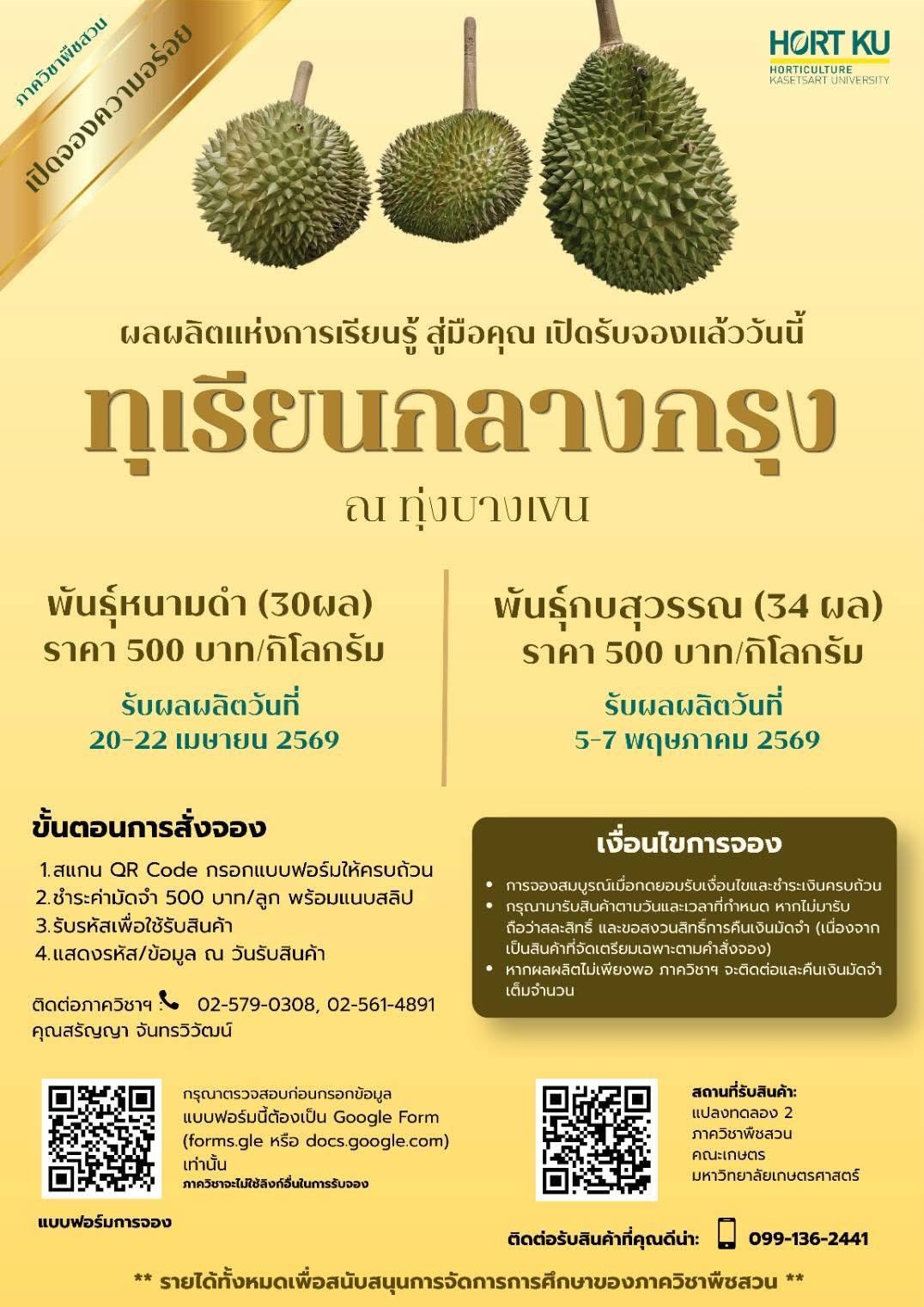 เปิดจองแล้ววันนี้! ทุเรียนคุณภาพจากแหล่งการเรียนรู้ สั่งตรงจากแปลงทดลองของมหาวิทยาลัยเกษตรศาสตร์