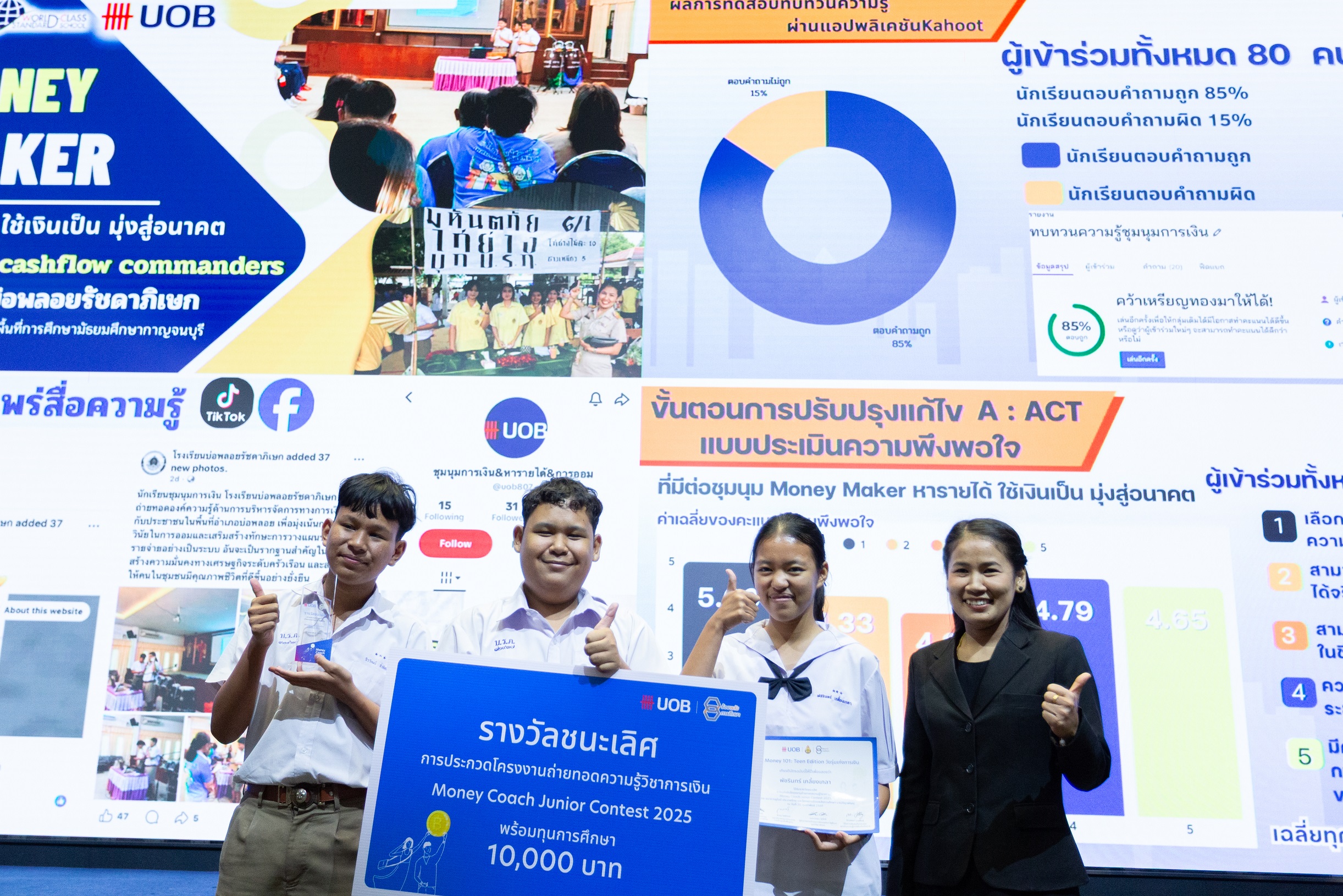 การประกวดโครงงาน Money Coach Junior Contest เปิดโอกาสให้นักเรียนระดับมัธยมศึกษาจากทั่วประเทศ ออกแบบและดำเนินโครงการส่งเสริมความรู้ทางการเงินให้กับโรงเรียน ครอบครัว และชุมชนของตนเอง โดยเป็นกิจกรรมเชิงปฏิบัติภายใต้หลักสูตรออนไลน์ UOB Money 101: Teen Edition ซึ่งธนาคาร ยูโอบีดำเนินงานร่วมกับ โครงการร้อยพลังการศึกษา มูลนิธิยุวพัฒน์