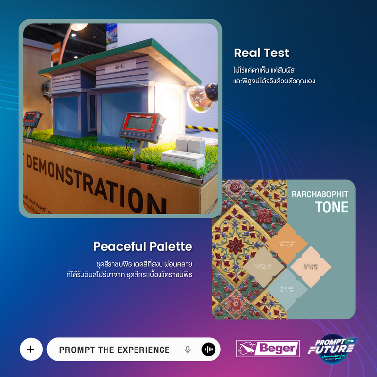 อีกหนึ่งไฮไลต์ที่โดดเด่นคือ Technical Mockup รูปแบบใหม่ ผ่านโมเดล 3 มิติ “เต่าเบเยอร์” ที่จำลองพื้นผิวจริงแบบ 360 องศา ช่วยให้ผู้เข้าชมสามารถเห็นประสิทธิภาพของระบบสีได้อย่างชัดเจนในสภาพแวดล้อมเสมือนจริง ยกระดับการนำเสนอเทคโนโลยีสู่ประสบการณ์ที่เข้าใจง่ายและจับต้องได้